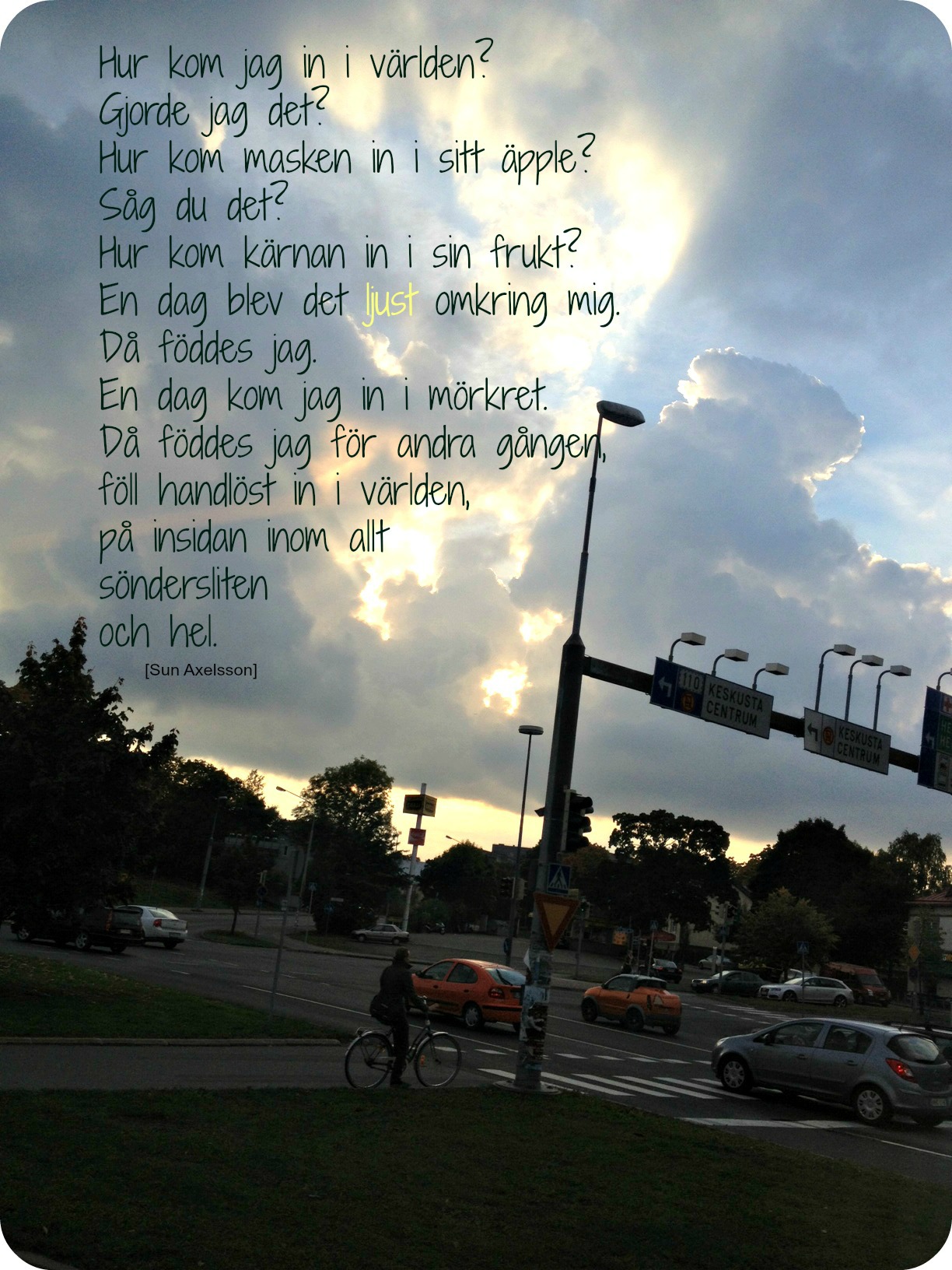 Dagens dikt och dagens moln. Så fint det ännu är. 16 grader idag och Jesushimmel på kvällen. Läsh!