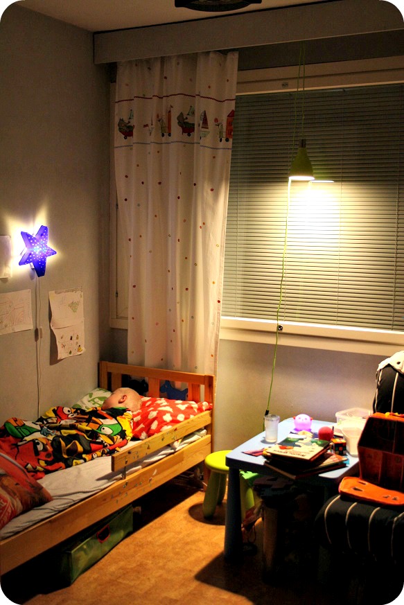 Det är svårt att minnas vilka storlekar det ska vara på lysrör och socklar, jag har fotat de gamla lamporna för att inte ta fel. Rekommenderas, jag tog genast rätt den här gången! William var med och hjälpte mig hitta rätt, han fick dessutom en ny läslampa, istället för den som stått på bordet. Nu är bordet fritt att leka på. Den gamla bordslampan som stått där, har hängt med länge. Den hade en trasig skärm och föll hela tiden ner när man tog böcker från bordet. Nu köpte vi en North Light-lampa från Clas Ohlsson och en 40Ws LED-glödlampa (som faktiskt ser ut som bara en glödlampa, fast den är LED) och den tänds på en gång! Hurra för det!