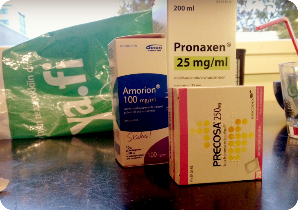 Isaac har varit förkyld och lite hostig i två veckor, lite från och till. Igår blev han slapp och ledsen, sade att ”örat e pipi” och ”vill ha mädisiin, mädisiin” fast vi varvade Panadol och Burana var fjärde timme. Jag läste i läkarböcker att akut öroninflammation borde gå över på ett par dagar, men med facit i hand ser jag att det antagligen hade börjat redan i veckan. Nu fick gick antiobiotika för dubbel öroninflammation, varav det ena örats trumhinna hade gått sönder. Det som kom ut var alltså inte vax, utan var. Stackars lilla Isaac, han har gråtit så mycket. Nu fick vi uppgraderad värkmedicin, till Pronaxen, och får varva det med 250 mg paracetamol (på asken står det från 17 kilo, men Isaac är 13,5. Enligt läkaren står det alltid rejält i underkant på paketen) gånger tre per dygn om det behövs.