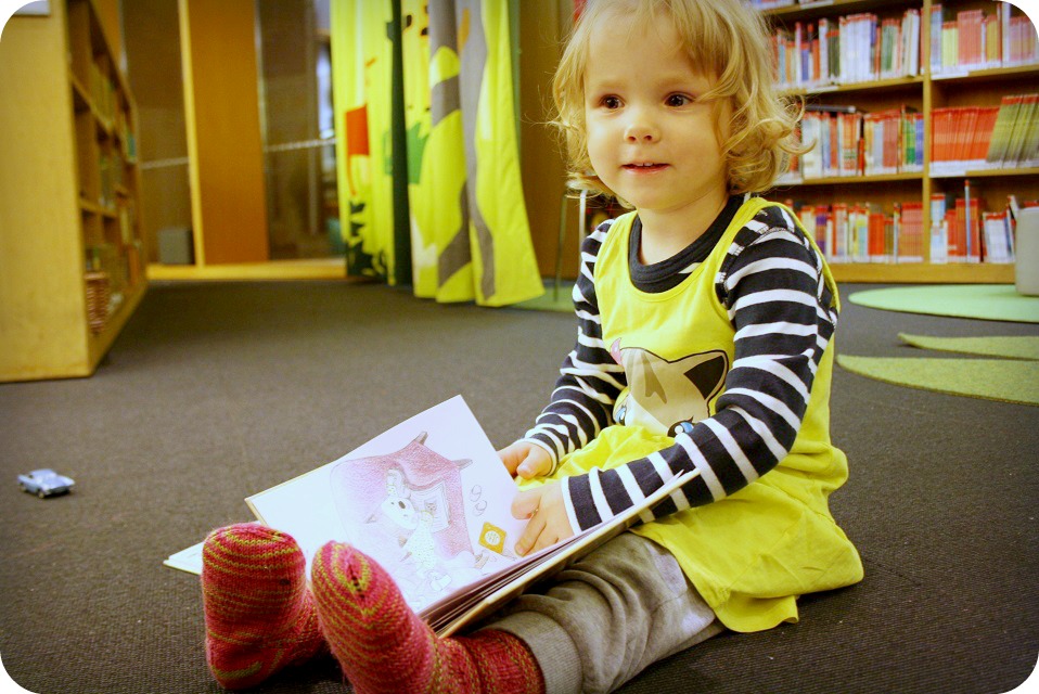 Milja är mycket bestämd – men mycket söt! Idag var det hon och jag som tog oss an biblioteket och kom hem med 31 nya barnböcker. Dessutom träffade vi V från dagis! Hej, det var kul att ses! Men huuu, va svårt att få en parkeringsplats! Milja och jag lyssnade på barnskivor i 25 minuter för att få en plats nära bibban. Arma Hullut Päivät, stick och brinn! Vi är faktiskt andra här i stan som vill leva vanligt! Och hur förklarar man för en tvååring att man inte bara får ställa bilen var som helst? Milja verkade dock fatta, efter att jag (stolt) fickparkerat framför bibban: