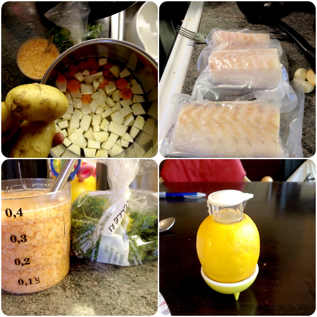 Jag hittade också en favoritfisk, Alaska sej-/gourmét-fileer. Den var riktigt god. Om man tinar den lite lätt och skär den i små bitar blir den färdig på nolltid i soppan.