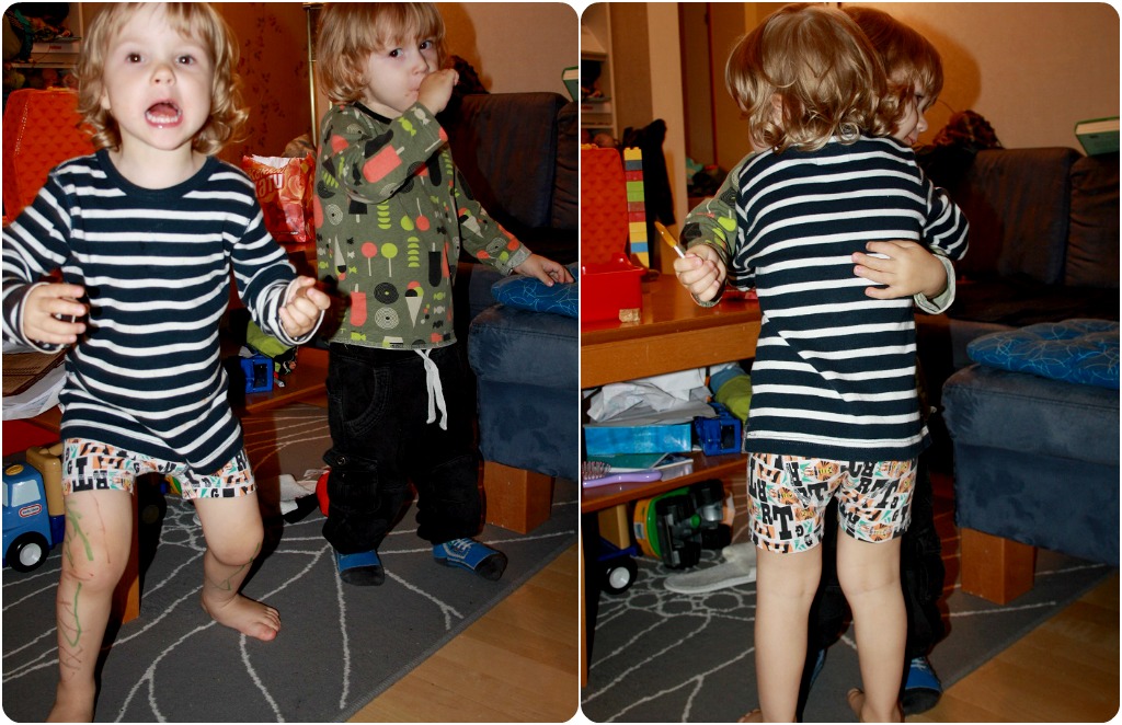 kollavajahaaarOch Milja, ja, den där Miljan med viljan. Hon är en så livsglad spjuver! Och hon ändrar sig hela tiden. Man har just fått på henne ett par byxor (så de hålls på), när hon bestämmer sig för att byta, fast egentligen skulle hon nog ha de första i alla fall! GRÅÅÅT och YYYL, vild panik!  så man tror öronen ska ramla av! Hur kan nån låta så HÖGT?! Observera hennes konstverk på benen, som kom till när hon hittade storebrors tuschpennor. Nåja, hon ritade i alla fall inte på väggen den här gången. (men kissade på golvet fem gånger idag. Håh håå, potträning, säger jag bara).
