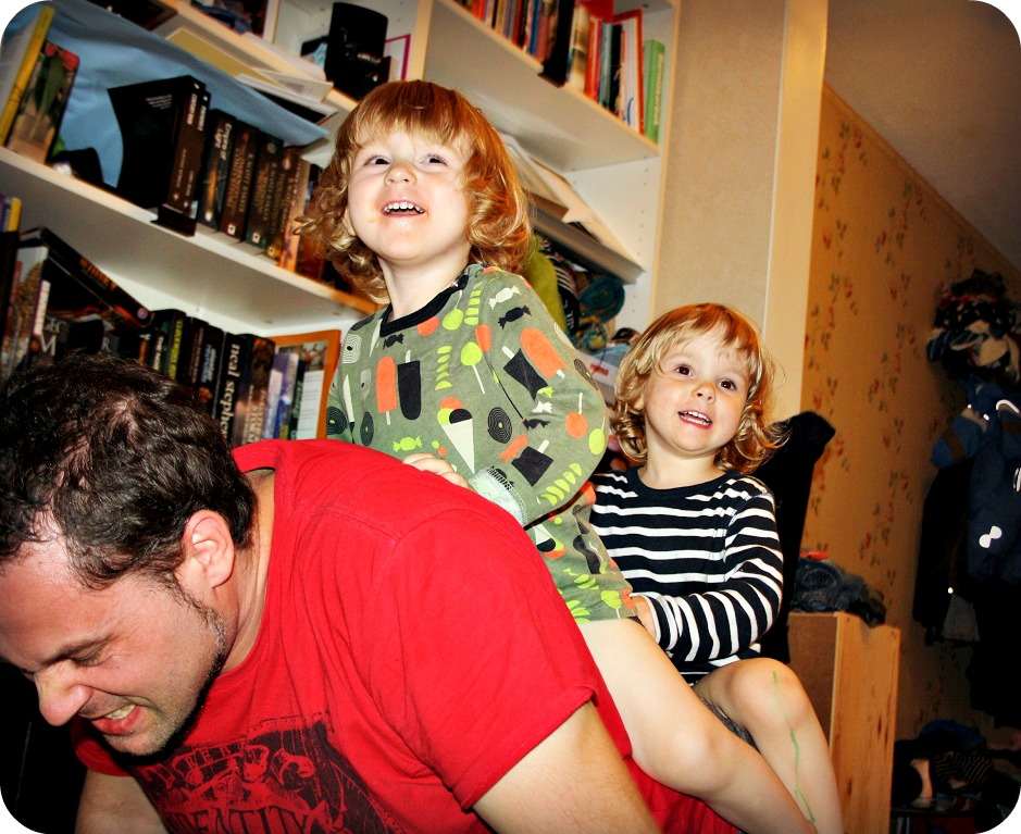 Mitt i allt detta är jag rädd för att själv dö. Jag står i duschen lite efter halv tio och begrundar dagen. Den började halv sju med att båda twinsen trängs i stora sängen och sparkar varandra, eftersom båda vill sova vidare, men nåns hand eller fot eller ben är i vägen för den andra. Blä va tråkigt att börja dagen med gråt. Å andra sidan ville de gärna gå upp och gosa på soffan. Båda ligger ovanpå mig eller intill mig i en enda hög av kärlek. Ett tag, ett litet ögonblick finns vi bara där, medan uppläsaren i Charlie Björn babblar nånstans långt borta.