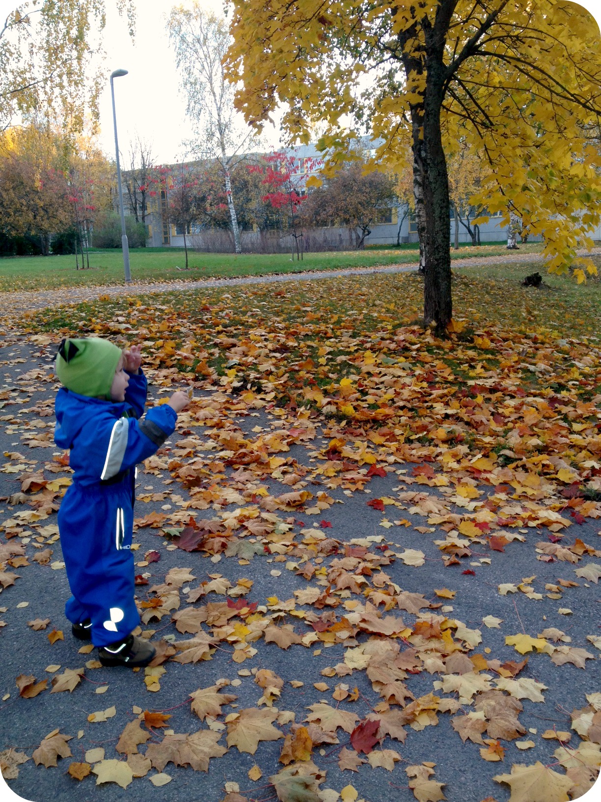 … och det är så sant. Löven väller ner och jag, som inte behöver kratta dem, bara njuter. De blir som en stor, mjuk matta över gräset. Vet ni hur det låter när det regnar hårt på löv? Det är som tusen små kattungar som traskar över silkespapper.