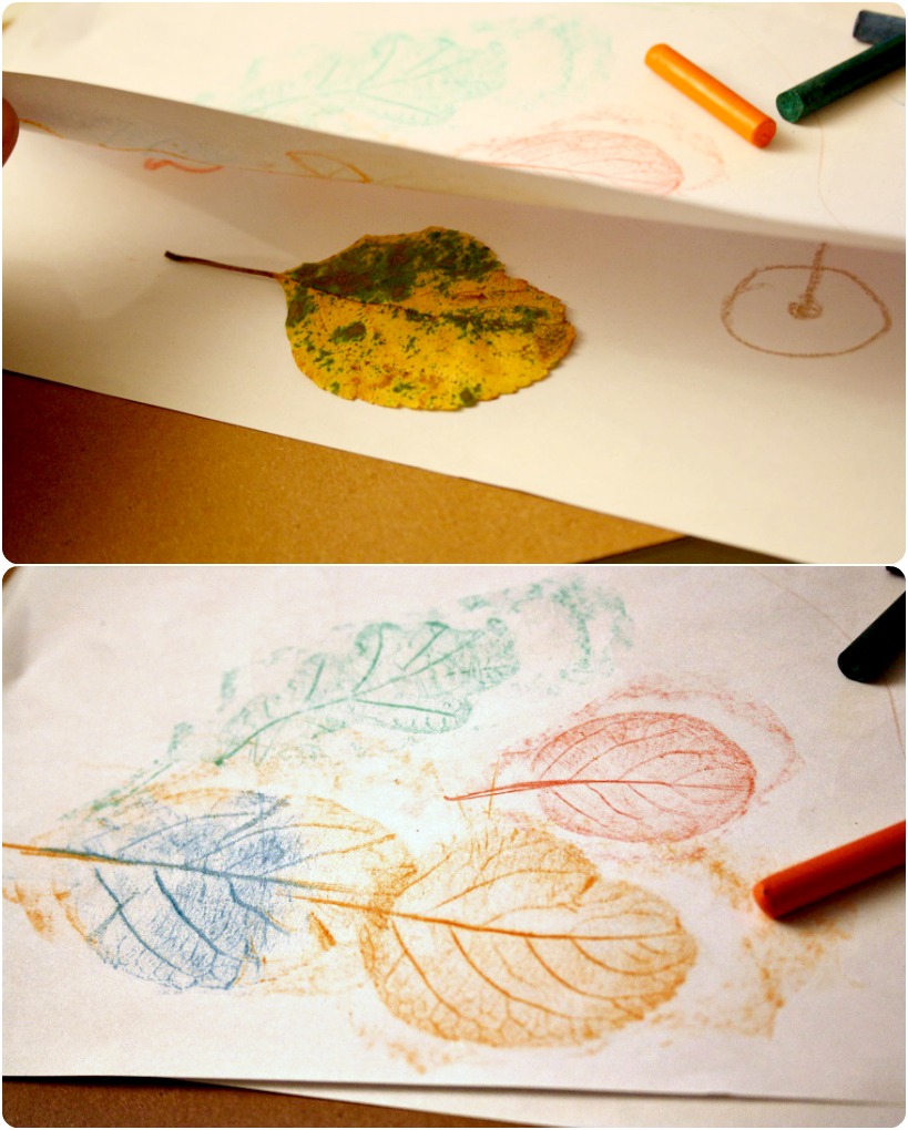 Lövavtryck! Barnsligt roligt och lätt med en bred krita. William hade gjort en massa fina träd och lövhögar i förskolan och leken fortsatte hemma (försöker också understöda allt sånt som inte har med datorer att göra just nu). Det funkar bra med färska löv, man behöver inte pressa dem före!
