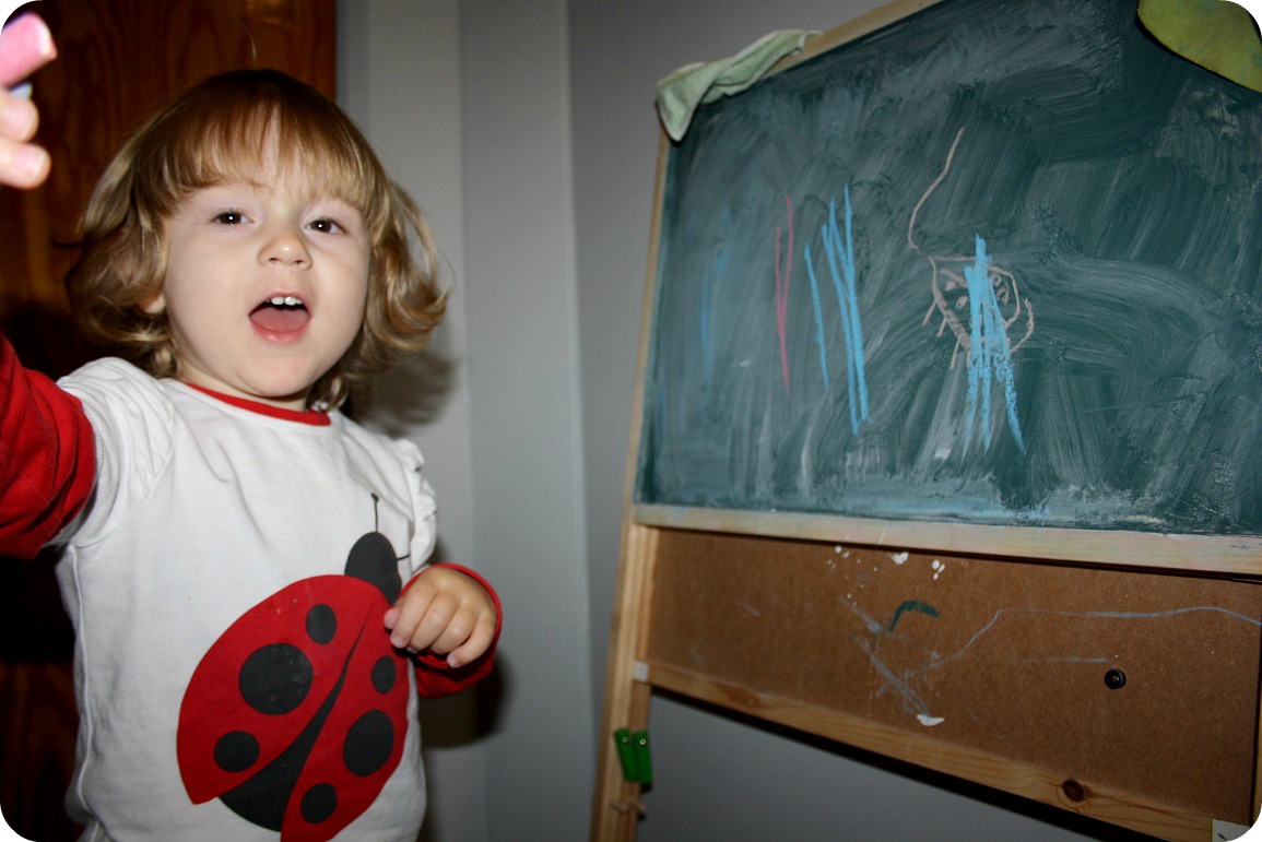 Vem ska få rita med kritorna och på hur stor del av tavlan? Milja och Wili hade inte lätt att samsas. En tvååring fattar ju inte att man inte får rita över mittenstrecken! Isaac fick rita för sig själv en stund, fast han gillade bäst att sudda.