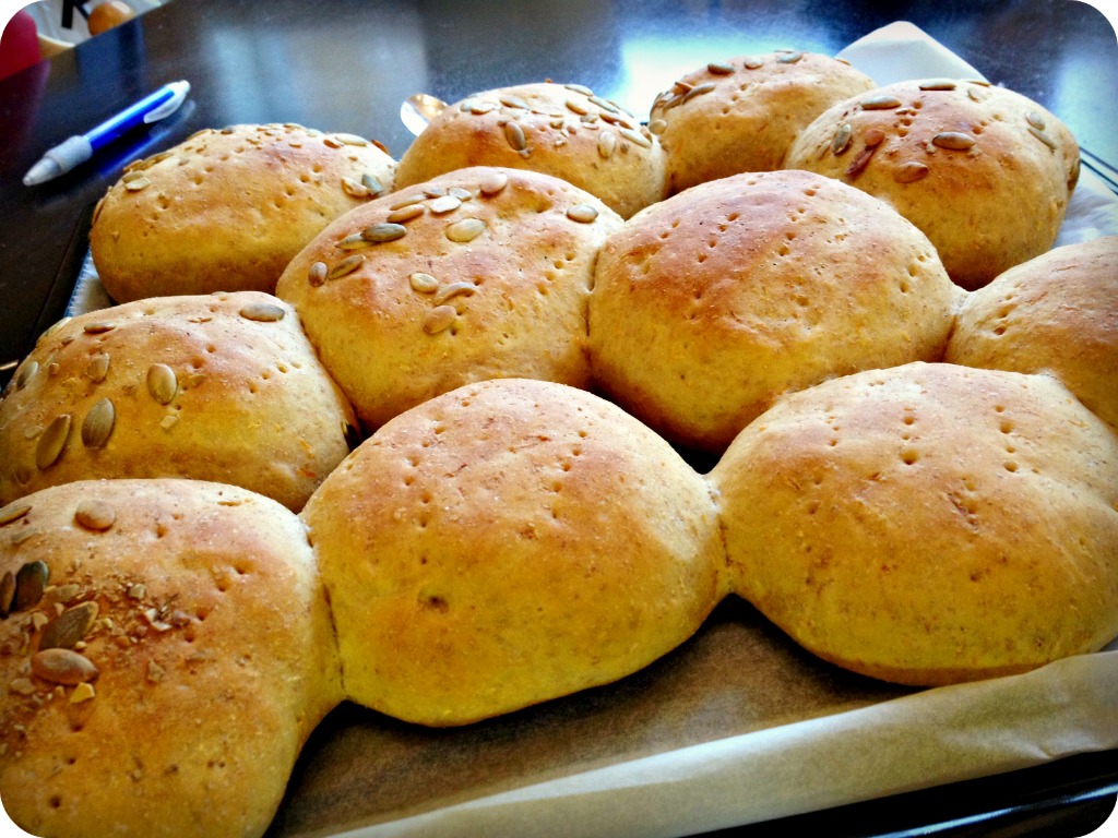 5. Rulla bröden i/strö över pumpafrön och forma dem till runda, lite platta bröd på en plåt. Oavsett om du knådar eller låter degen vara, låt jäsa (en gång till), ca 30 minuter.
