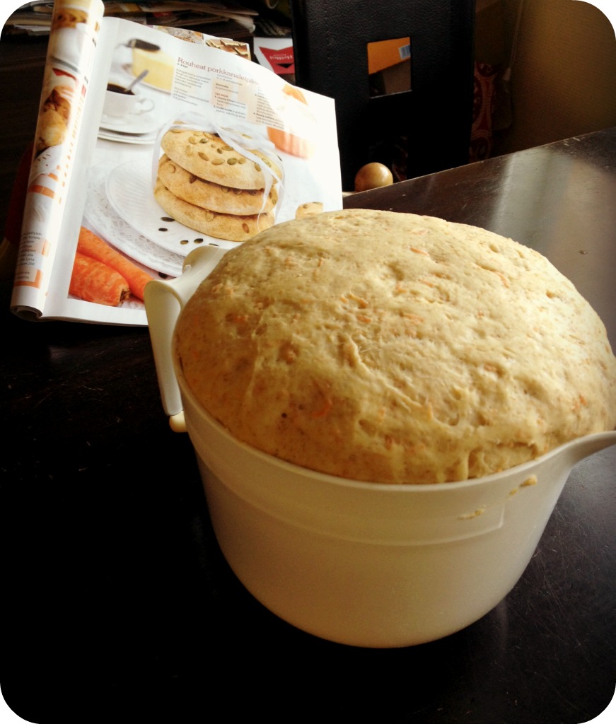 3. Sätt i morötter och mjöl, lite i taget. Knåda degen och låt den jäsa under bakduk i ca 45 minuter. Jag brukar lämna lite mjöl i botten av skålen/plastburken, eftersom jag knådar för hand och inte i någon brödmaskin. Då lossnar degen lättare, efter att den jäst klart.