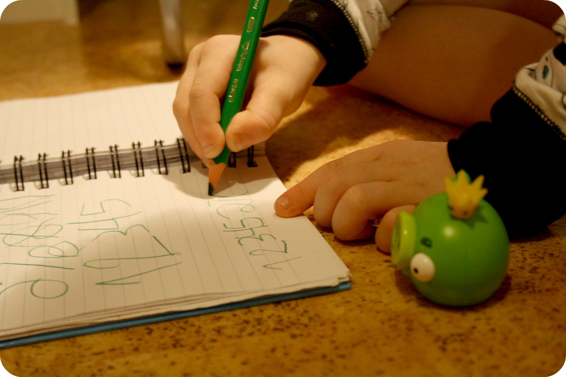 – REKTANGEL, säger W och tar upp leksaksgrisen nära sin mun, som för att viska. Och vet du, vi vuxna tycker att du ritar fint i alla fall.