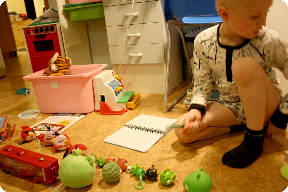 Och så fortsätter leken, medan Isaac har hittat sitt favorittåg. Milja kommer och vill vara med, men det går inte så bra, hon vill sno alla Angry Birds, som sitter vid sina bord eller leker med klossar och dockor. Jag måste medge att om man dristar sig att leka och fundera en stund med sina barn, genom lekar, får man reda på mycket om vad de gör på dagarna! Det funkar inte att fråga Vad gjorde ni idag? Våra sexåringar är verkligen tålamodsprövande, men de är också extremt duktiga problemlösare.