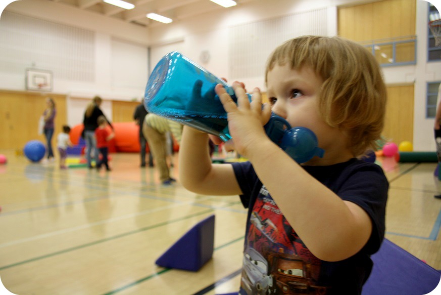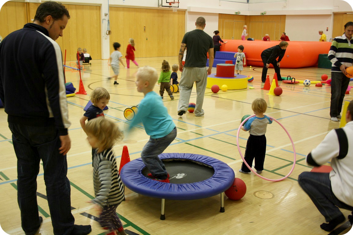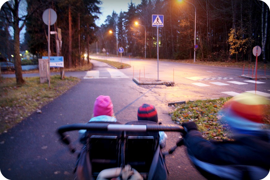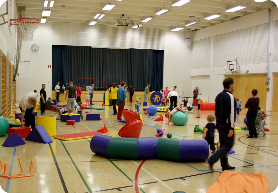 Jag fick i alla fall med alla barn, vagnen, på mig egna kläder, fick med saft och papper att snyta små näsor med (eller torka saft…) och kläder på samtliga barn. Vi höll på att inte hitta, för idag gick vi till en annan skola (de ordnar gympagruppen på olika ställen runt om i stan). Den jättestora Kuppishallen brukar dra mest folk, den har också skilda avdelningar för stora och små barn, men den var stängd på grund av röd helg. När vi hittade rätt, hittade vi inte in! Vi travade runt skolan, drog vagnen uppför trappor och manade på små fötter att gå själva.