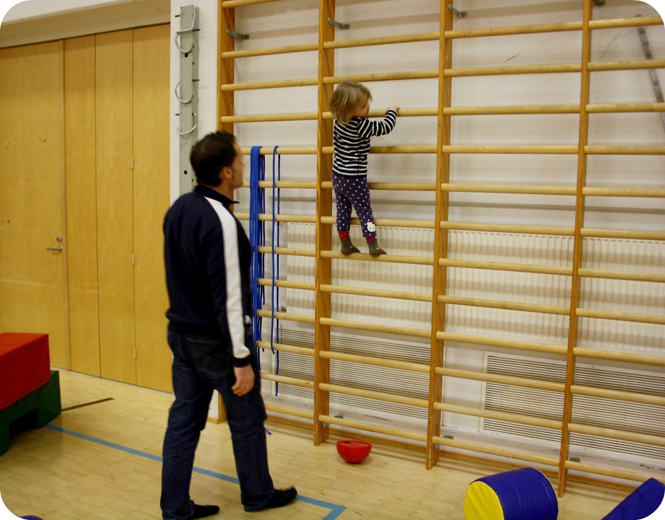 kanselvMilja är i alla fall den stora ”kläppraren” i vår familj. Mika är den som säger ”oj oj, ramla inte nu”, och går efter om hon klättrar för högt. Jag, å andra sidan, anser att om hon kommer upp, får hon komma ner. Det ledde till att hon klättrade så högt som möjligt på ribbstolen när pappa var nära, medan hon kom halvvägs och sedan vände och klättrade ned, när jag stod en bit ifrån.