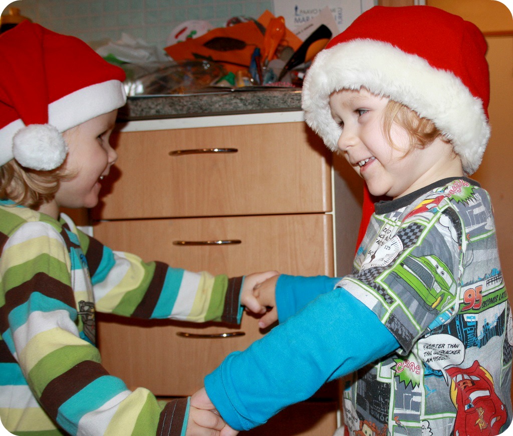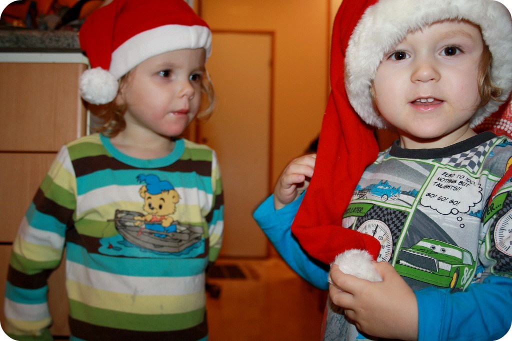 Jag trodde inte vi skulle komma iväg i morse. Milja klagade på att det var fel färger på kläderna (för mycket blått!), Isaac hittade inte en leksak och det var fel på några byxor, varpå han slängde sig på golvet och sprang sedan iväg. Hur hjälper man då en sexåring att höras och ”komma sig iväg”, när man inte ens hörs? Men på nåt vis kom vi iväg, W fick äta frukost i bilen för att vi skulle hinna med twinsens frukost på dagis och så rullade det på. Självklart glömde vi bort att twinsen hade julfest, så de fick låna tomteluvor (jag skämdes lite). Skolarbeten för min del, samtalet här ovan, Mika på julfest, faffa&fammo hämtar William, jag handlar och hämtar twinsen, julpyntar och städar och leker med dem. Så mycket liv i livet, att man blir jätttteeeglaaaad när Isaac somnar i mina armar och Milja bakom min rygg. Men kul har de haft, twinsen.