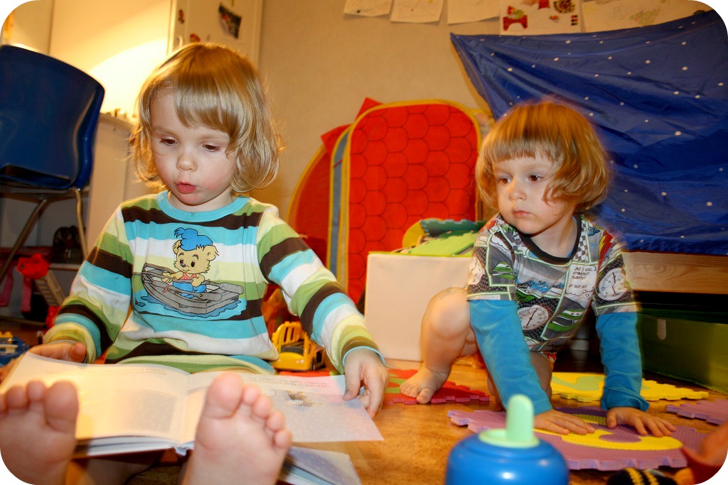 – Mamma! Åh, Bu&Bä kommer… åh, stoooja bollen, den rullar! Kommer inte loss! Det ha hänt nåt föskäckligt, mamma! Ja läser föj dej mamma!