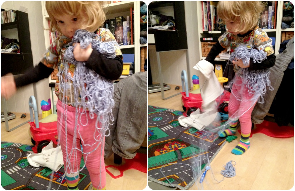 Milja blev så sött arg på ett garnnystan som hade trasslat in sig i hennes trasa. ”Domma sussu, kom loss!” Självfallet var det garnets fel!