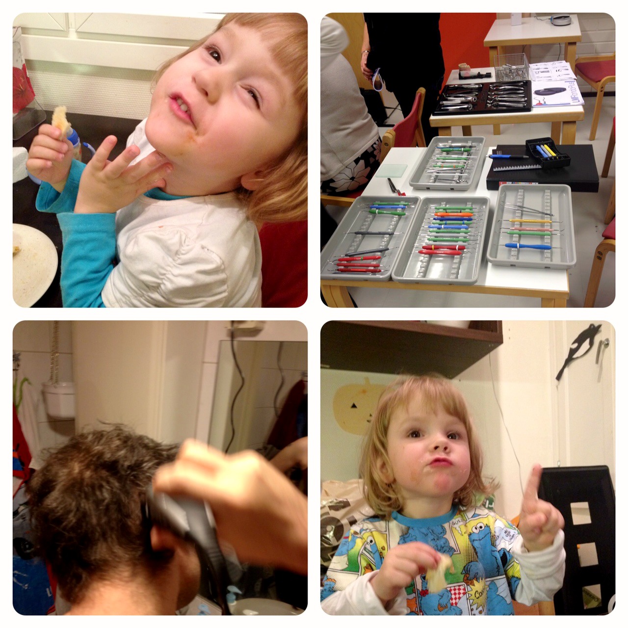 Det tunga är att ha praktik samtidigt och hinna med familjen. Praktik är inte jobb, utan du ska bekanta dig med stället i detalj, ta reda på saker, fota, söka, fråga. Vara obekväm. Veta vissa saker. Jag somnar på soffan – igen. Är det såhär folk säger att småbarnsåren swischar förbi, så förstår jag. Vi värmer köttbullar, äter gårdagens överblivna pommes, Mika klipper sitt eget hår (tack och lov för trimmers!) för att jag inte kommit mig för. Fast jag hjälpte honom jämna håret och det blev jättebra.