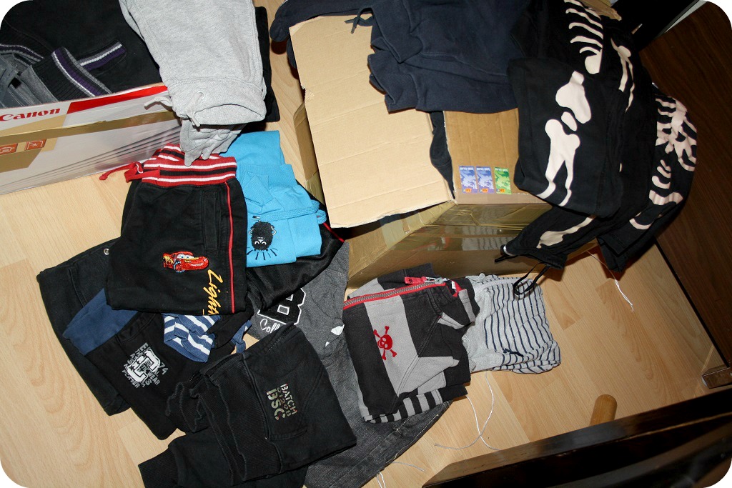 Jag hann också hämta två stora paket på Posten – äntligen. Tusen, tusen tack för kläderna, mamma och Lena! Det här var en av de bästa presenterna på länge, en tidig julklapp! Speciellt spökpyjamaserna och alla underbara byxor som inte ens syns på bilden. Mössor, underkläder, strukna, doftar syrrans tvättmedel.