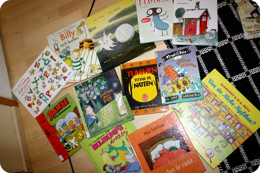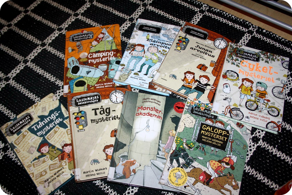 Bibbaböcker släpades hem. Åt de små, åt de lite större. Äntligen fick vi tag i en del LasseMaja-böckor som tidigare varit utlånade. Och åt de små läser vi om en del favoriter och lägger till andra nya. Vissa på finska, då övar man båda språken, även som uppläsare. Det är betydligt svårare att läsa på ett främmande språk och betona rätt saker, men övning ger träning.