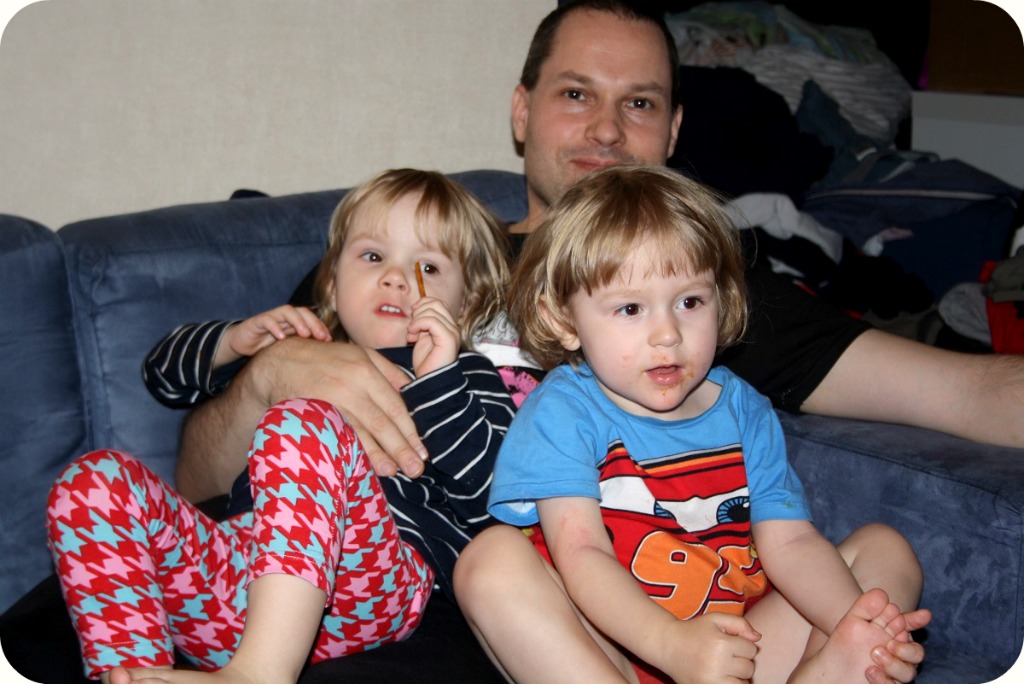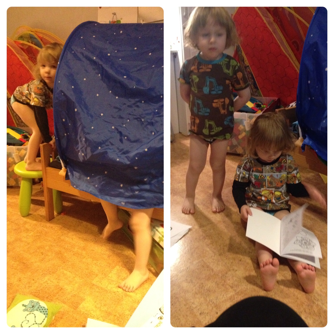 Twinsen är vilda som rebelliska vildvittror. De ritar på Williams bordslampa, de kör HÅRT med sopbilar och bussar på golvet i hela lägenheten, de vägrar ha kläder (speciellt byxor och pyjamasar) i omgångar, de vill absolut inte äta och verkligen inte sova! Nej, nej, halv elva kan de somna, på sin höjd! Vi borde antingen korta ner dagsömnen ännu mer, eller snart ta bort den, för de vill ändå upp lite före åtta.