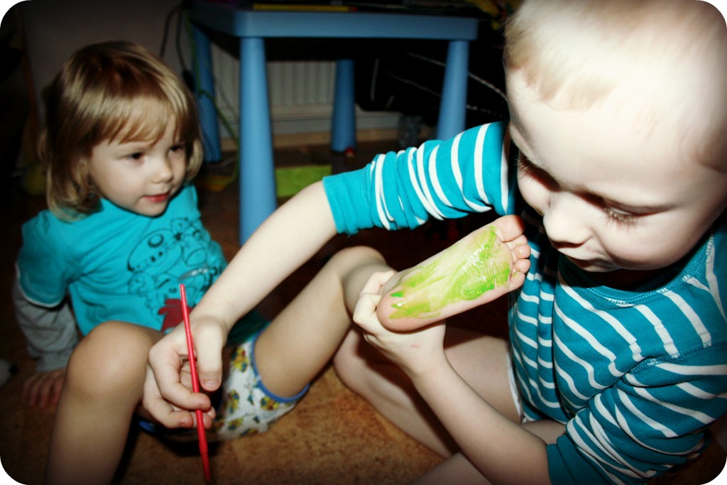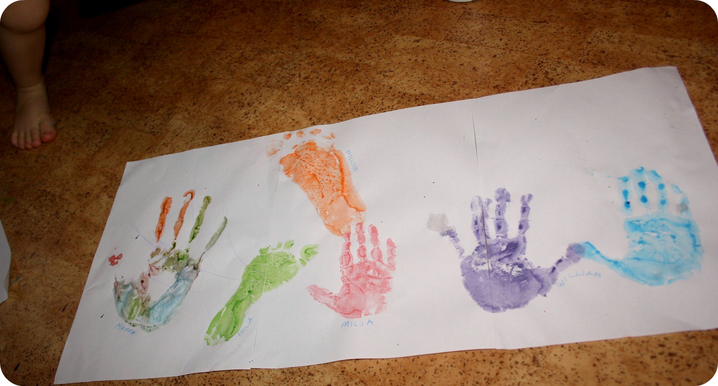 enlitentecknigVi försökte hitta på aktiviteter för de små. Jag målade avtryck med alla barnen, men Isaac ville inte var med. ”Nu är det MIN tur” byttes av med ”Det kittlas” och ivrigt ryckande i penseln. Nåja, vi fick våra händer och lite fötter där, sånt är alltid trevligt. Och en bonusdetalj: Milja ville måla min hand med olika färger. Nej, var min spontana tanke (på samma sätt som föräldrar alltid bara vill ha vita bollar eller röda bollar i en julgran, för det SKA vara så, enligt dem!), men jag lät henne måla. Och vet ni vad, det blev ju som att jag är en blandning av alla mina barn, när man tänker på det lite konstnärligt. 🙂