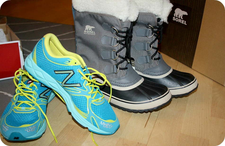 Två par mycket efterlängtade skor för 100 euro tillsammans! Redan innan jul bestämde Mika och jag att vi inte köper julklappar åt varann, utan istället satsar på nåt under rean, på mellandagarna. Jag har ett par Icebugs, men inga löpardojor. Dessa New Balance (som Mika orerade högt och glatt om, att de är bland de bästa på marknaden) sägs bara bra och de är väldigt lätta. Och mina Sorel! Jeee, äntligen! Har längtat och väntat och nu hade de både löpar- och stövlelskor till -40 procent! Dessa två kostade alltså runt 100 euro tillsammans och jag hade fått ett presentkort (tack M&J) som passade just till det. Halleluja. Nu ligger de där och väntar, mina löpskor, på årets första tur.