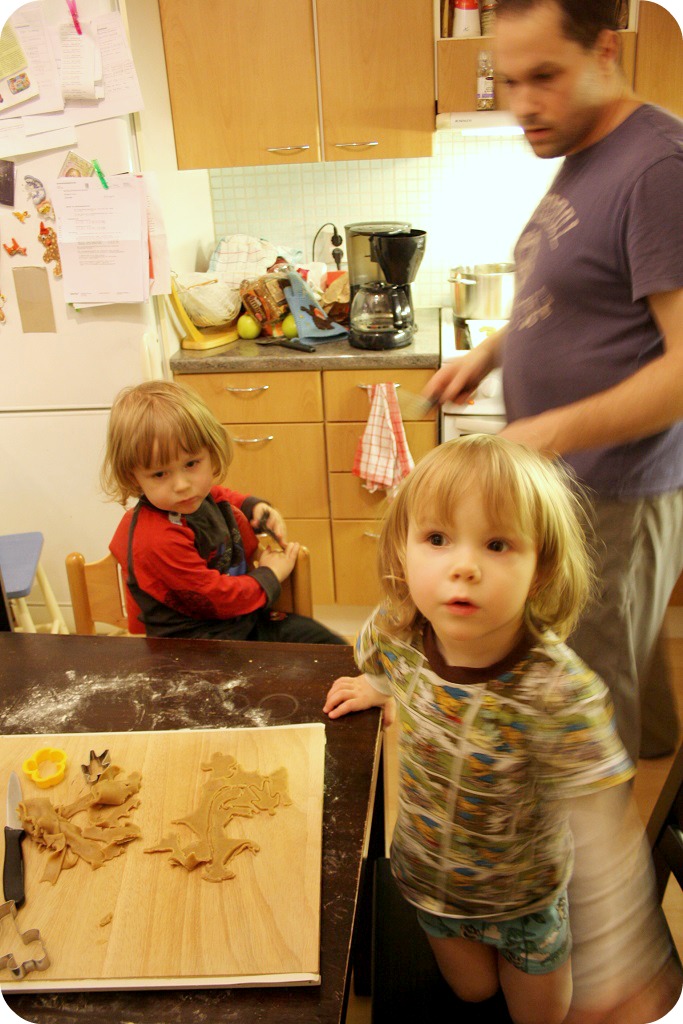 Ställde till med pepparkaksbak, eftersom Isaac hade pratat om ”pepparkakadeg som man göl till en geeting” sedan i morse. Jag gjorde nog rätt i att hålla mig borta från köket, jag tittade bara in och påpekade att man kanske borde baka dem lite tunnare. Äh, spelar roll. Ungarna var glada och brandvarnaren pep inte.