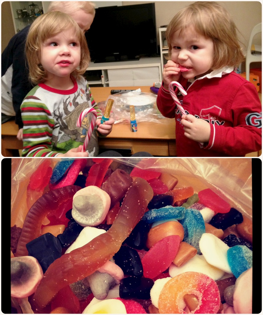 Ikväll var alla hemma som vanligt, ungarna tryckte i sig godis, som W och jag hade valt. Jag fattar inte hur Isaac lyckas tappa sina slickepinnar varje gång. Där ligger de på parketten i hundra småbitar – han tuggar i sig och jag torkar. Men så är det, när man är fem före tre år. Milja biter söndar sina slickepinnar, trots förmaningar om att akta tänderna. Sen ser vi på veckans Buu-klubbavsnitt och söndagens Mumin för sjunde gången, medan jag får krama twinsen en stund…. och slockar på soffan. Tankar tvillingkärlek. Milja kommer och pysslar om mig och drar ett täcke över mig och pussar mig på munnen så jag vaknar till. Fniss!
