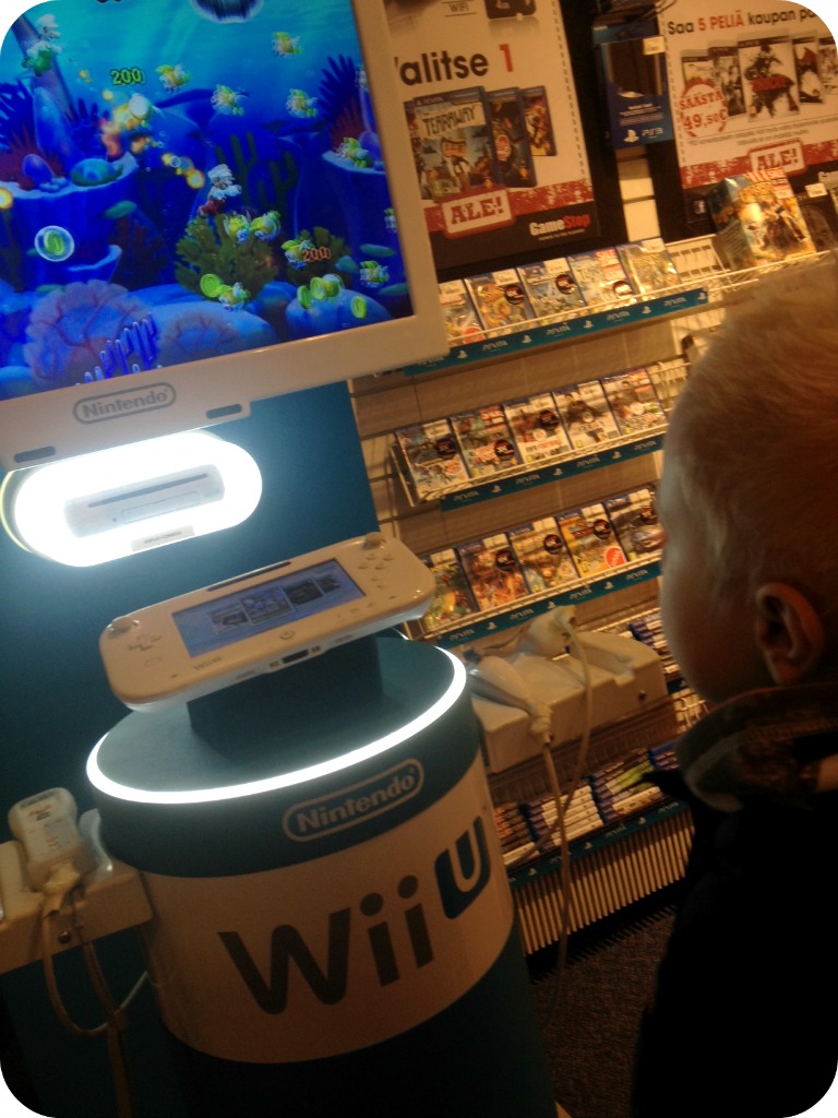 Lyckan med att bara ha ett stort barn ibland: att kunna gå och kolla på en video av New Super Mario U på GameStop. Så länge ungarna nöjer sig med att SE på videon är det bra. Och jag njuter också, för det här är ett intresse vi kan dela, William och jag.
