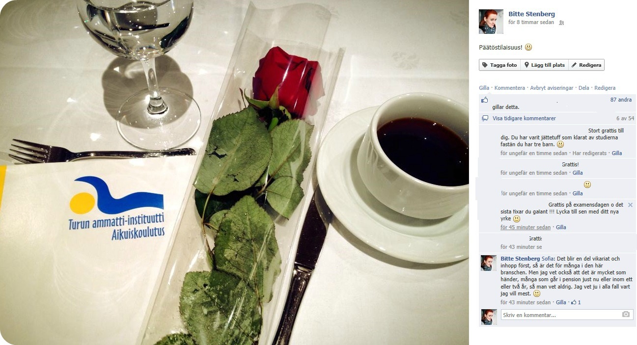 Många har frågat mig om detta är en bransch jag kan tänka mig att jobba inom/stanna vid. JA! Absolut! Annars skulle jag inte ha satsat stora delar av mitt jullov, av januari, av mina lediga kvällar och av ungarnas tid på att skriva, skriva, meka, peta, pyssla och få ihop allt. Och det är ju ”bara en yrkesutbildning”. Vad då bara? Jag fungerar i den här miljön! Ända sedan tiden vi bodde i Sverige har jag från olika håll fått höra att jag borde ta bättre vara på min tradenomutbildning inom handel och förvaltning, som jag faktiskt också har. Personligen anser jag att alla utbildningar är bra och att kunskap är en lätt börda. Man har nytta av allt man lär sig, oavsett vad man gör.