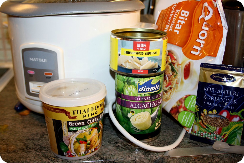 … och de passar bra till en currygryta. Lite stark blev den, men rätt bra. Borde ha haft i lite mindre grön (alltför färsk) currypasta och lite mer salt. Men till och med jag kunde äta den, så farligt blev det inte (fast jag öste på en del grynost på tallriken också).