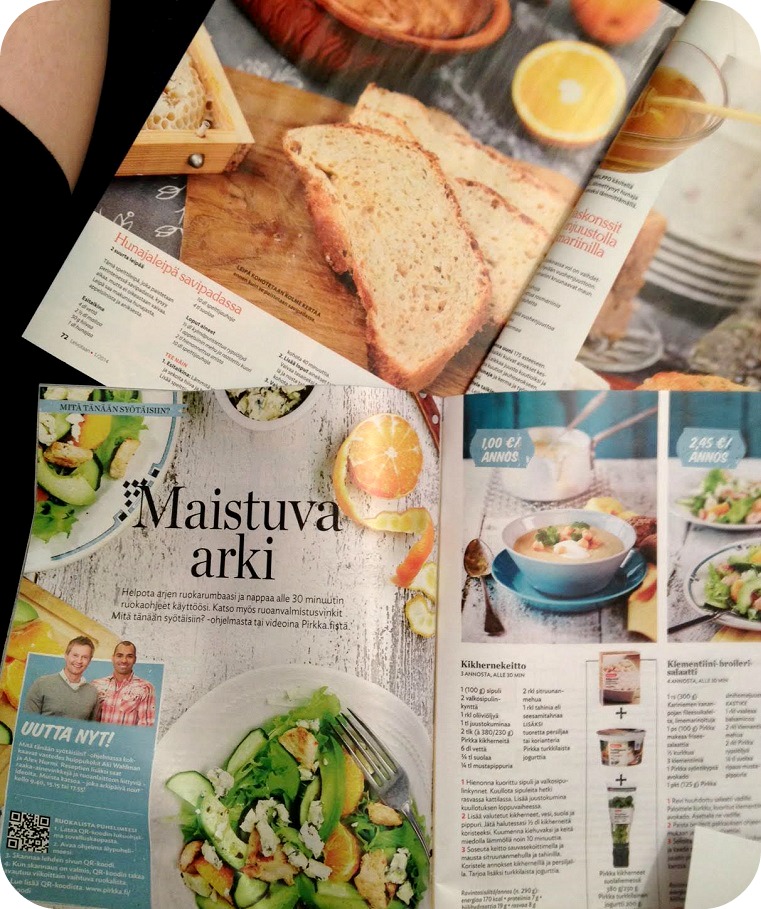 På tal om mat har jag världens matdille nu igen. Jag vill laga ALLT i de här tidningarna! Samtidigt! Honungsbröd i lergryta (coolt, fast det ska jäsa tre gånger), kikärtssoppa, brownie-mudcake, limedrömmar och en massa annat smaskens! (tidningarna på bilden är senaste Leivotaan! och dagens Pirkka-tidning).