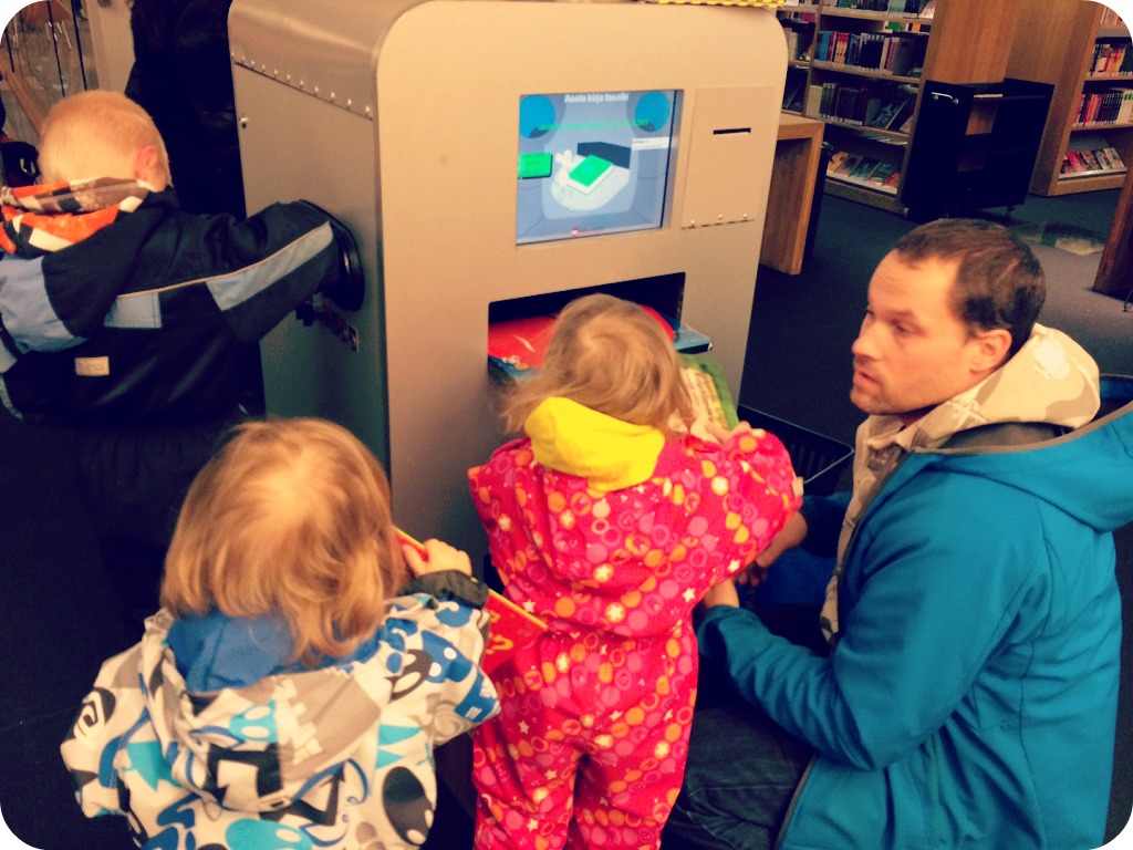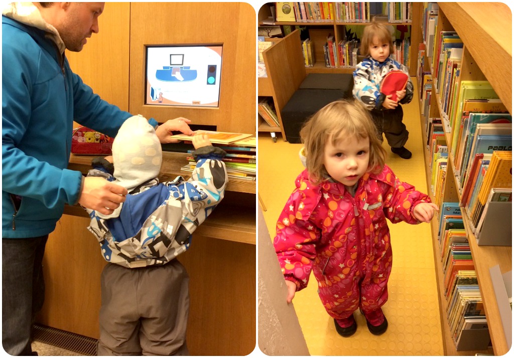 Från lugna kvällar med tv-slappande till livliga barn och fullt ös igen. Vi hade egentligen planerat in en promenad till skogen/stenstaden, men ett ruskigt slaskoväder satte stopp för det. Alla snö som kom ner smalt på en gång och vinden ven. Blä! Vad händer med den här vintern? Här i Åbo är det snart slut på snö. Eftersom Milja dessutom varit/är lite förkyld, gick vi en hastig sväng till bibban för att göra nånting med kidsen.