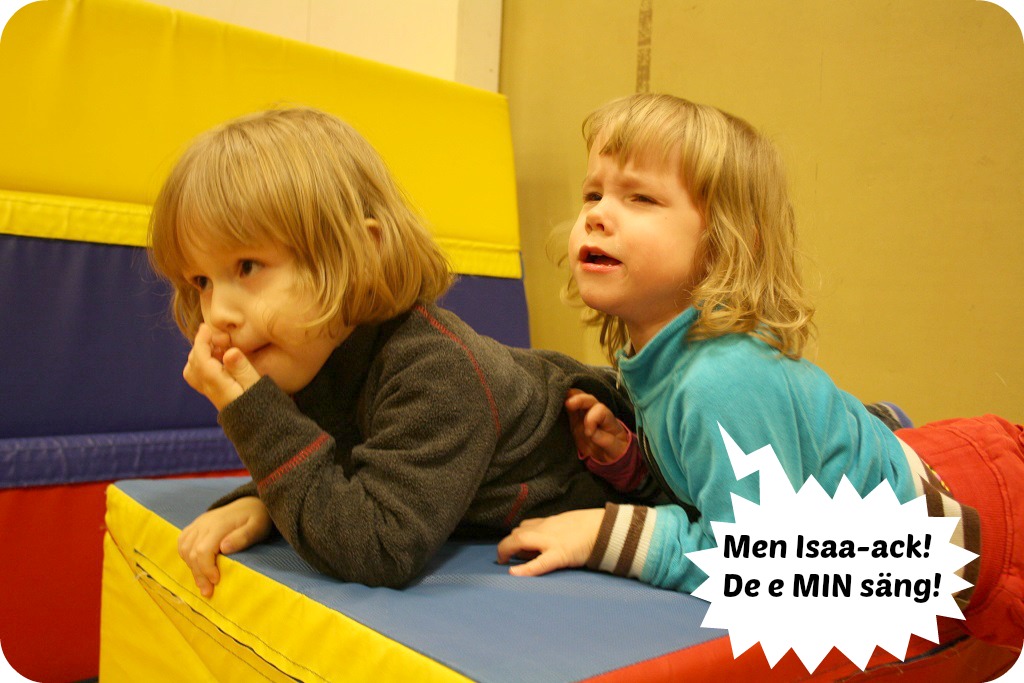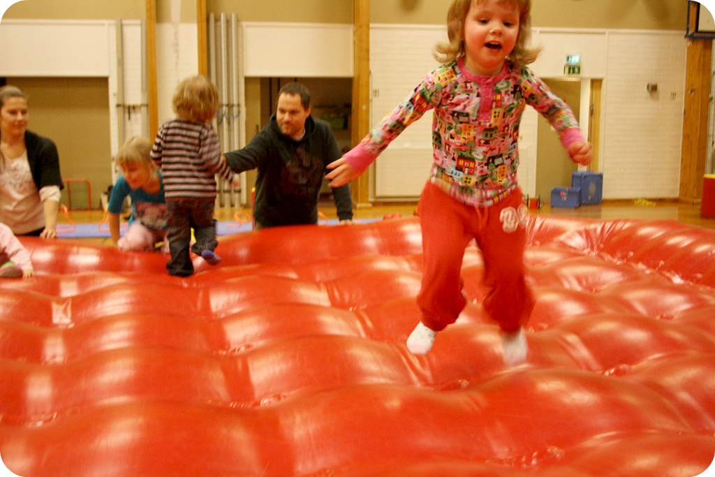 Och det här tvåårshumöret går lite opp och ner. Men ganska mycket opp i alla fall! Och nu, nu äntligen har Milja vågat börja studsa och hoppa, efter att jag klev upp på den stora madrassen och satt med dem där en stund. Vilken eufori! De ville ju absolut inte hem – fast storebror kilat iväg med fammo redan långt innan.