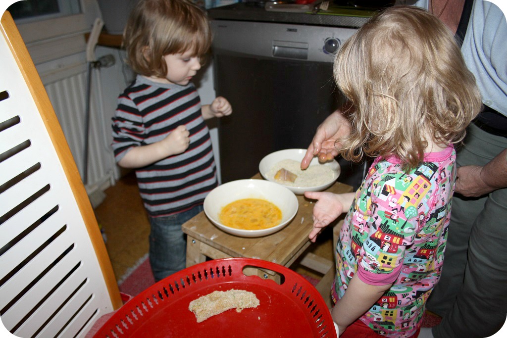 Dagsömn eller vila var bara att glömma. Det ledde till att två trötta och lite ledsna tvillingar somnade i bilen och sov cirka tio minuter, som vanligt, på väg till fammo och faffa, som bjöd på mos och stekt fisk. Men vilken tur att man får vara med och laga mat! Milja sprang med glas åt alla och dukade lite på borden, William var med och gjorde mos, twinsen fick panera fisk och knäcka ägg (med lite hjälp). Jag var tvungen att gå därifrån, jag har inte sådär mycket tålamod, för finfint fixade de fisken utan mig!