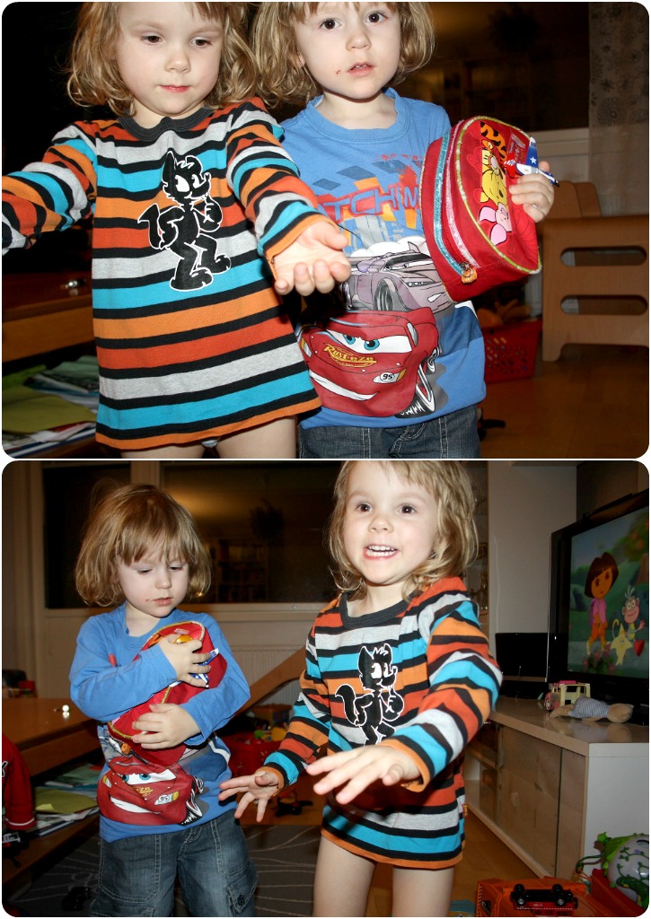 detudesmafieTwinsen fick arvegods. Gissa om det är populärt med Mumin, Bamse och Blixten? Och ja, Dora Utforskaren förstås, det programmet ser vi vaaaarje dag. Suck och stön, nu börjar vi kunna det här med ”Ryggsäck, ryggsäck” och ”Open!” på alla dörrar ”Ser du Swiper! Säg Swiper!”. Men vi härdar ut och det har lett till att ungarna har lärt sig några nya engelska ord.