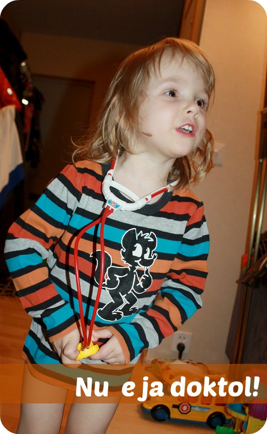jaedoktooojEtt gammalt stetoskop, som tillhört William, fick hänga med hem till Åbo. Det blev stora stridigheter om vem som skulle vara doktor – på riktigt! Milja kallar stetoskopet för ”vita och röda hjärtat”.