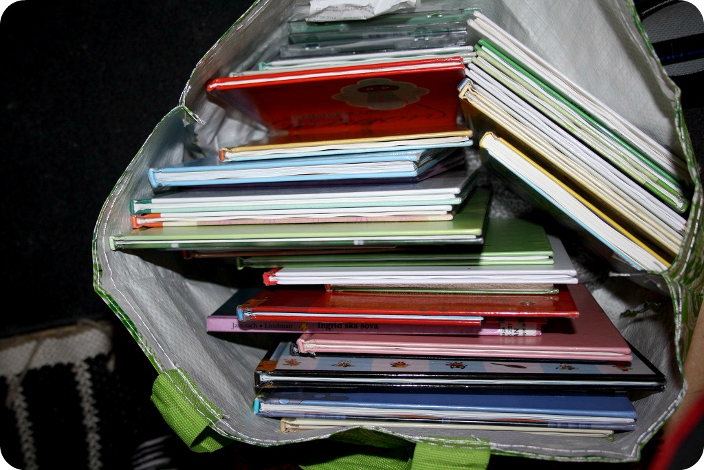 Vi har laddat upp med ny läslust. Mina böcker pep i bibbaporten. Fasen, då måste man dra fram alla 32 igen och koda om dem. Bibbatanten tittade lite på min bokhög och jag fick fram att ”vi läser ganska mycket”, varpå hon log lite mot mig och sa att ”det sägs var bra”. Ibland undrar jag hur många böcker normala familjer lånar? (PS. Man FÅR låna 50 i taget, har jag numera lärt mig).