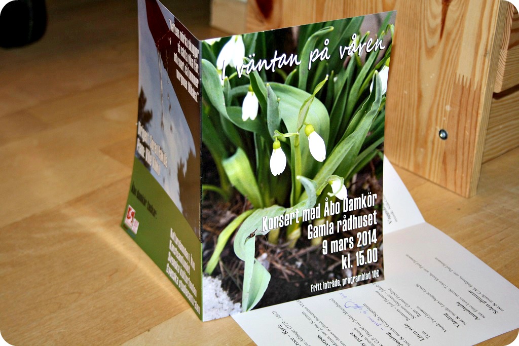 Jag fick äntligen se hur vårt program såg ut också, det som jag pillade ihop till vår förra konsert. Själva konserten missade jag i och med att jag var sjuk, men programbladet blev lyckat – som jag hade tänkt det! Det är knepigt med trycksaker när man är hobbydesigner, men jag fick tips från tryckeriet, så de får lite smygreklam av mig här. Tack Juvenes print, det blev jättebra!
