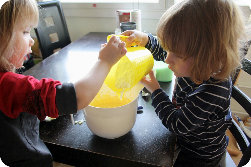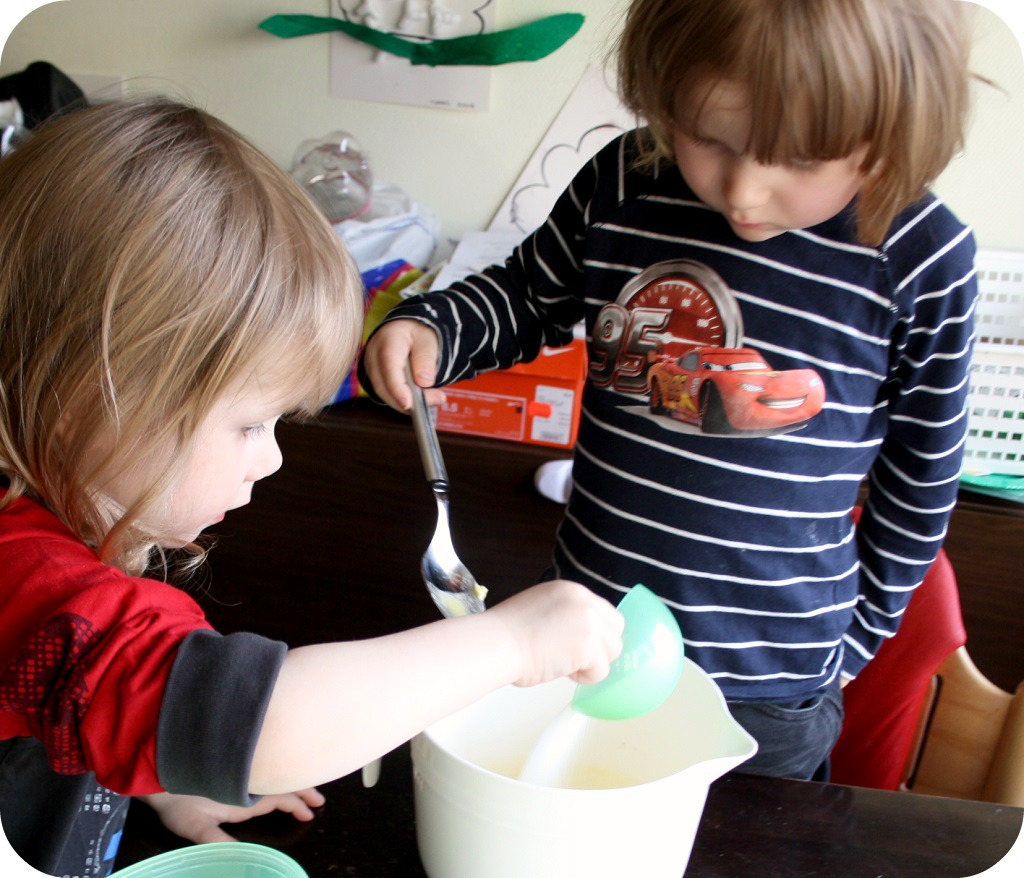 En hjälpande hand eller två är bra, och de är nöjda bara de får vara med. Att knäcka ägg var inte så lätt. Milja stod helt stilla, vi höll äggen tillsammans och när det sprak SKREK hon till! Högt, gällt och kort!