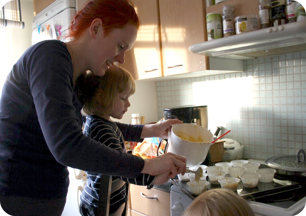Igår tog jag mig också tid att baka med twinsen, jag hade lovat dem det. De är så sjukt duktiga på att hjälpa till och vill gärna göra så mycket de bara kan. De plockade fram stolar och tvättade händerna, kavlade upp ärmarna (nåja, en av dem i alla fall) och jag lovade baka muffins med dem. Det är nåt som går fort och som man kan använda elvisp till och som de tycker om.