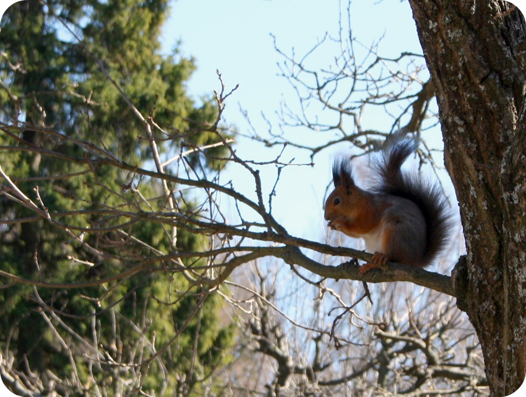 Och där satt han, Kurre Ekorre, och knaprade i sig ungarnas torra bullar. Han kom ner, försikigt, hängde kvar på stammen tills läget var lugnt, hämtade en smula och hastade upp igen med sitt byte och knaprade i sig. Vi trodde han skulle hämta nötterna vi kastat ut, men icke. Bullar är bäst!