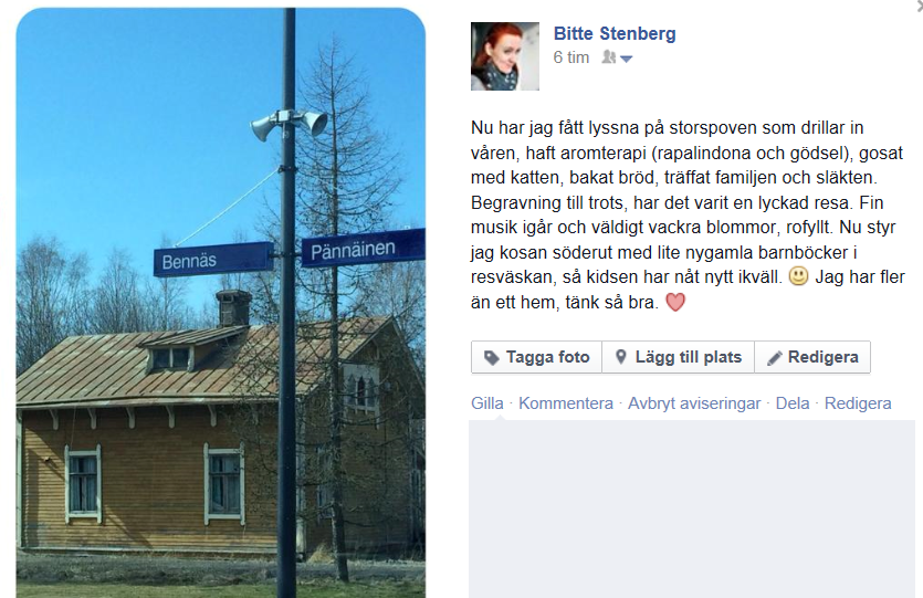 Det är skönt med miljöombyte. Man slipper tänka på tvättberg och smutsiga fönster, sånt om gör mig galen ibland här hemma. Och så hade jag ju lyxen att få åka själv, det ska vi inte sticka under stol med. För trots saknad och begravning, hann jag också prata med min egen familj och med släkten, det är trots allt trevligt att ses, det blir inte så ofta. Fast nästa gång får det bli under lite trevligare omständigheter, det tyckte alla!