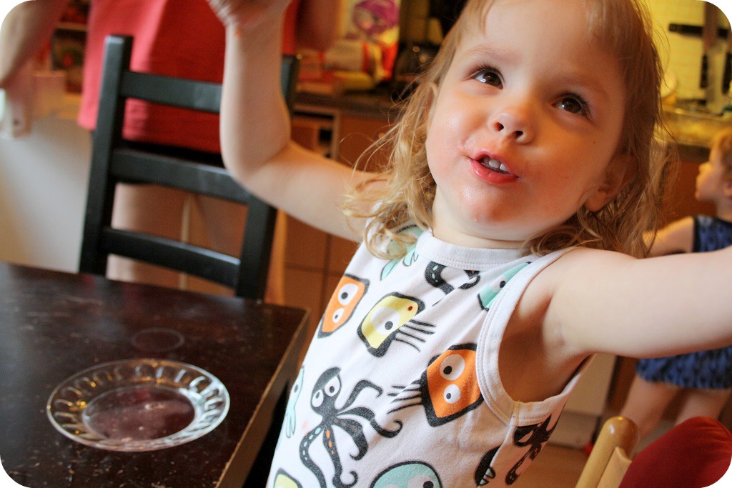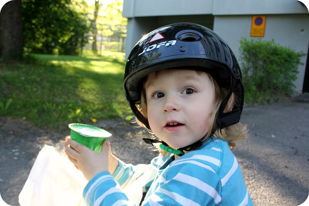 Milja hade fått följa med pappa till bibban idag och hon hade pratat konstans, hela vägen. Hon drillade som en lärka, om affärer, om reklamer och glass, om allt hon ville smaka på och allt hon såg. Hemma hade hon hittat mitt toalettdoftblock. Eller tja, det är inte ett block, det är en klick med gelé man ska sätta inuti toan, så den doftar gott och så att kalket försvinner lättare. Jag är helt säker på att hon har petat på det, för hennes händer doftade toablock igår, varpå jag genast bad henne tvätta händerna! Huu, jag får byta tillbaka till vanliga block, den där gelén var för intressant, trots att den håller längre. 😦