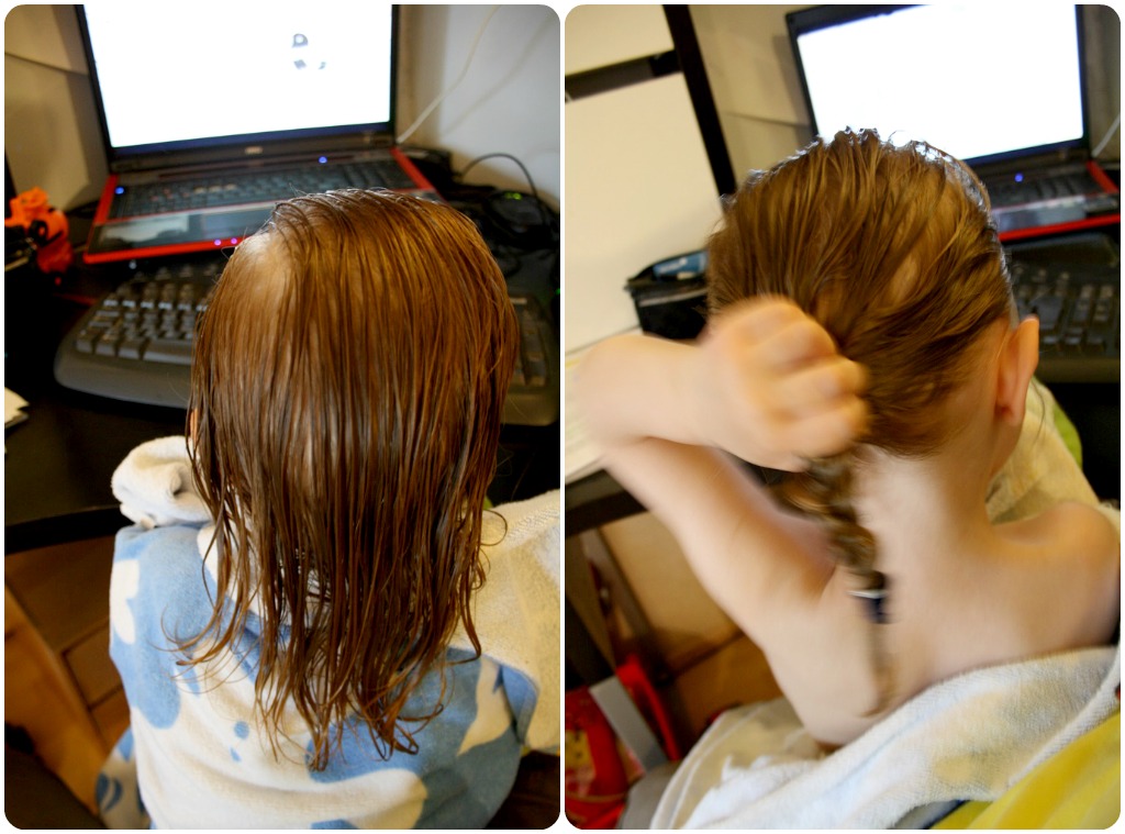 Så där försvann den. När får man börja fläta håret? Jag väntar! Isaac däremot, brydde sig inte om fast jag petade på hans hår och satte upp det i en hästsvans, som på den övre bilden. Okej, okej, ja mamma och fammo, jag ska klippa hans hår. SNART! Inte än! (ska njuta av mitt lilla barn, så länge han tillåter mig att vara mammas pojke).