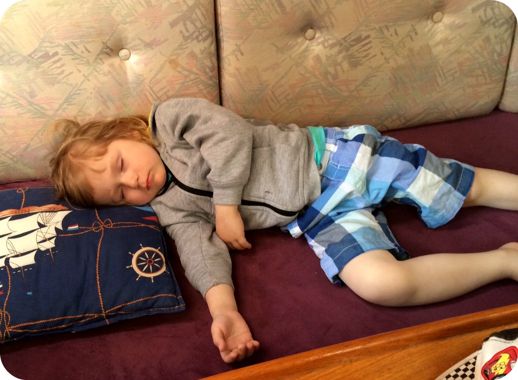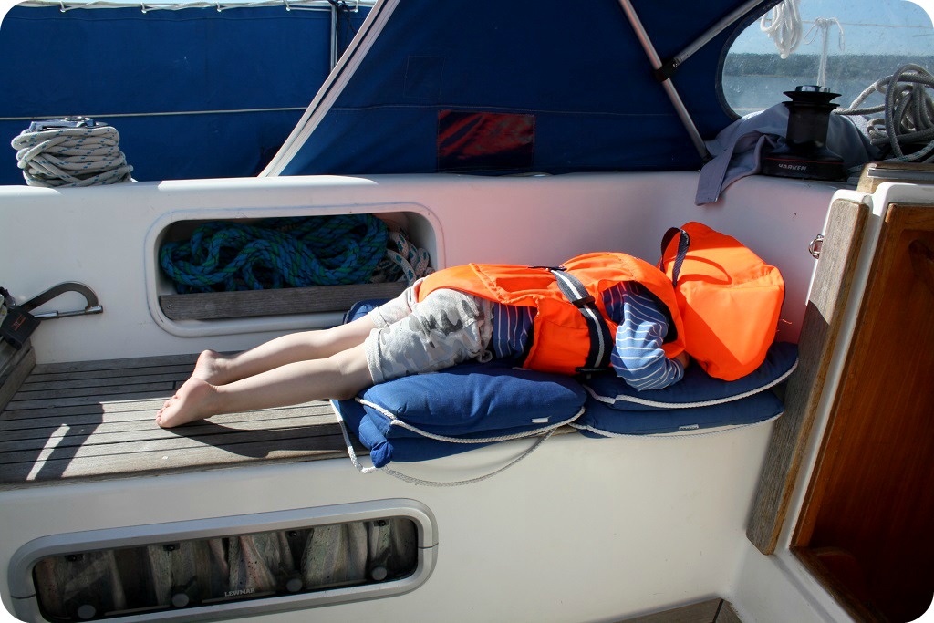 Sjölivet tar på. Ungarna fick nog lite av en friskluftschock. Twinsen, som vägrar att sova på dagarna, somnade när vi seglade hemåt. Lite här och där.
