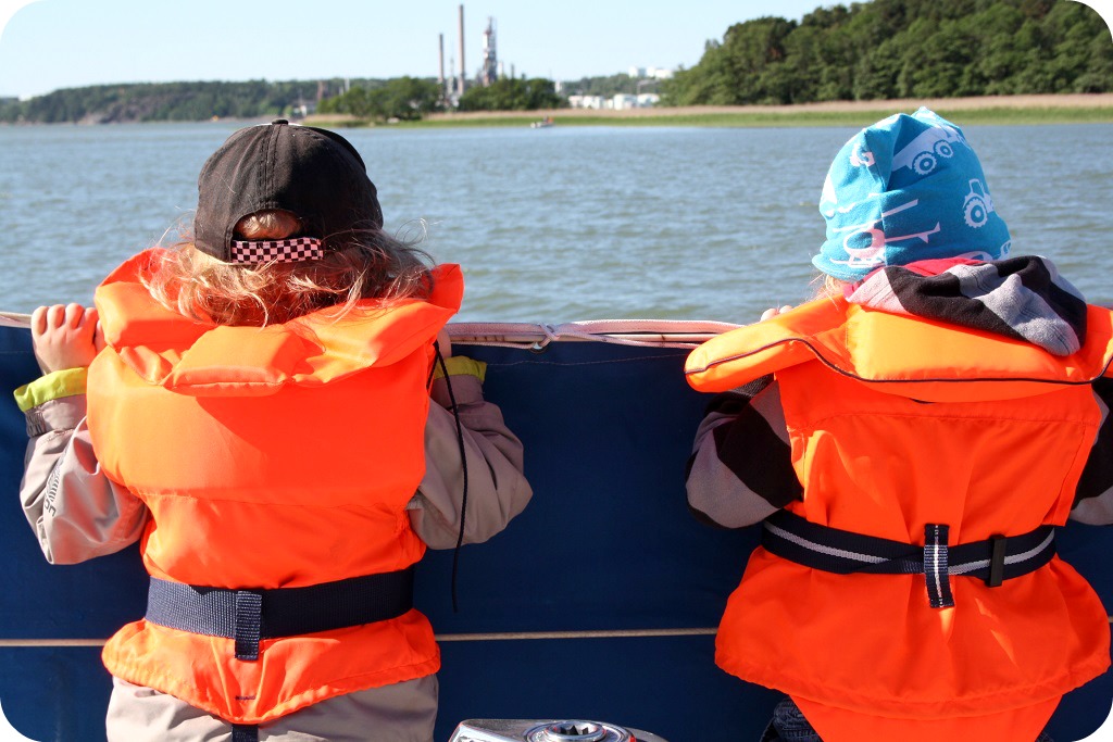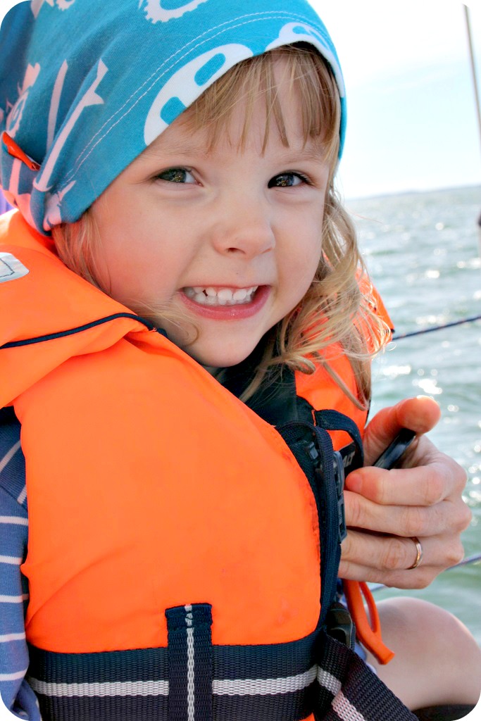 Milja är den mest våghalsiga och ville sitta på däck, nära kanten. Jag var egentligen mest rädd för att hon skulle tappa sin kära Porkkana-Nenä i vattnet och vara ledsen över det, men allt gick bra. Både barn och djur hölls ombord utan problem hela resan! Och ja, man får passa på, hålla i, ibland i smyg, fast de säger emot (mamma! Ja kan selv!) och vara på sin vakt hela tiden, men på det stora hela tycker jag det gick superbra under hela resan. Ungarna fattar det här med flytvästar, de sitter stilla då och då och njuter av båtlivet!