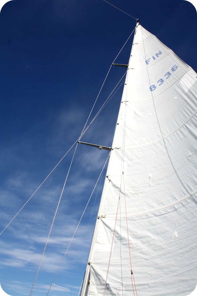 Det blev otroligt bra segelvindar på söndagen och vi kunde dra upp storseglet (och kasta bort ett getingbylla, som fanns inuti!) och segla med bara storen – och göra över sju knop mellan varven!