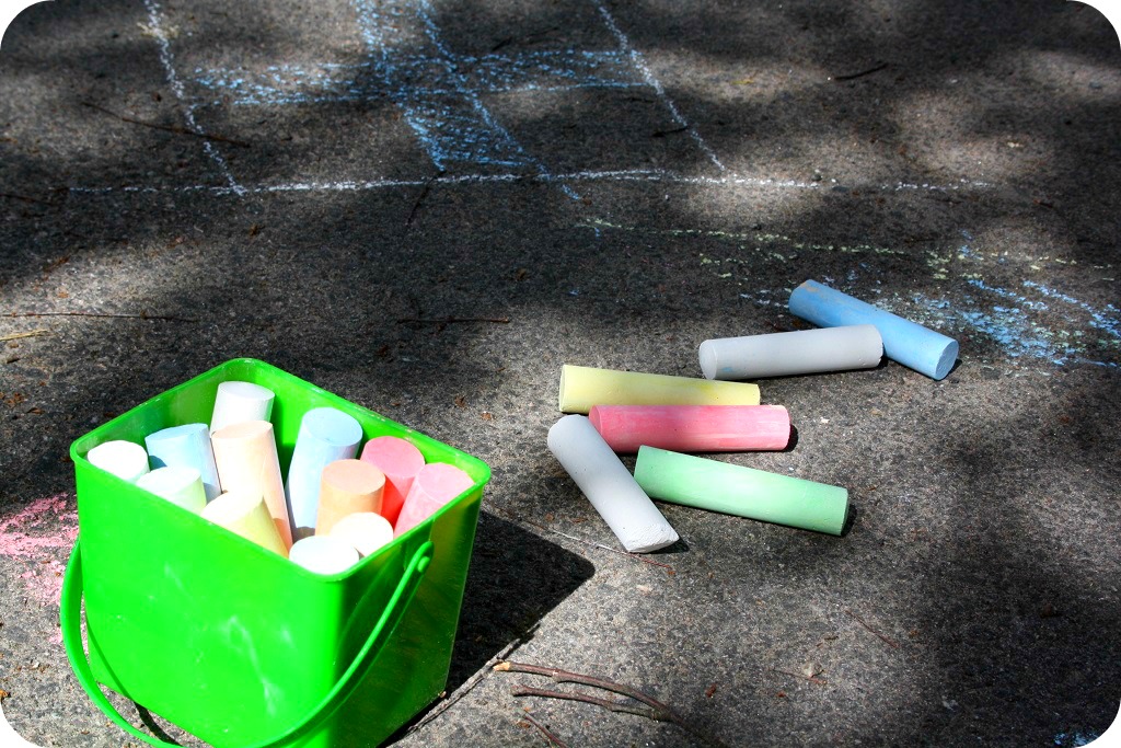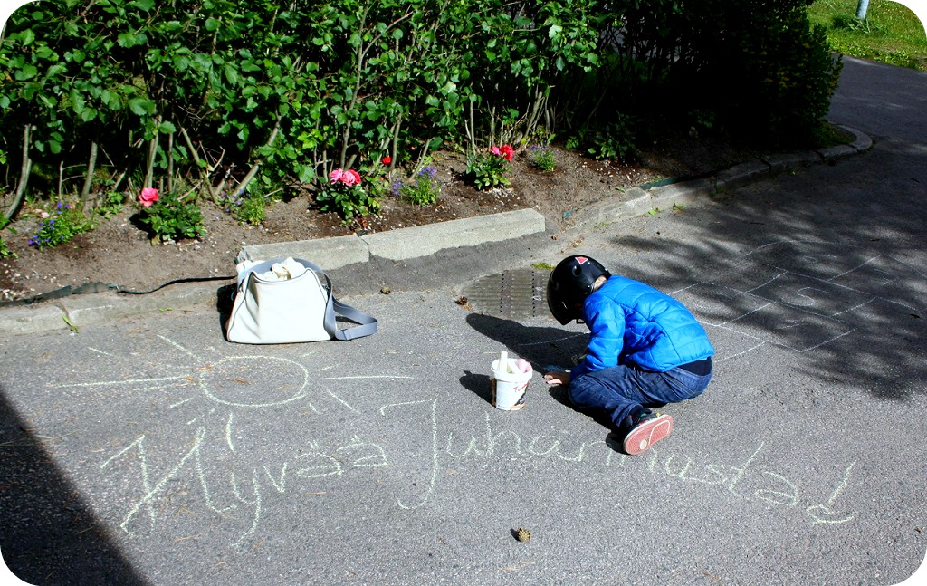 Jag hittade asfaltskritor för 2,50 på posten, när jag hämtade ett paket. Visst är det märkligt att man länge letat efter nåt – och så finns det rakt framför en! Så bra! Milja var den som tyckte allra mest om dem!