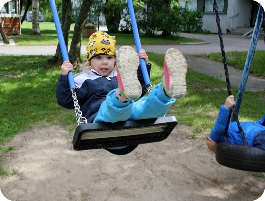 Milja har kommit på att hon nästan kan gunga själv. Högt och länge och mycket! Och mycket fart ska det vara! Nån dag kommer hon att trilla illa, den lilla våghalsigen, men jag hoppas jag har fel. Kanske små tjejer är gjorda av gummi? Det känns så ibland.