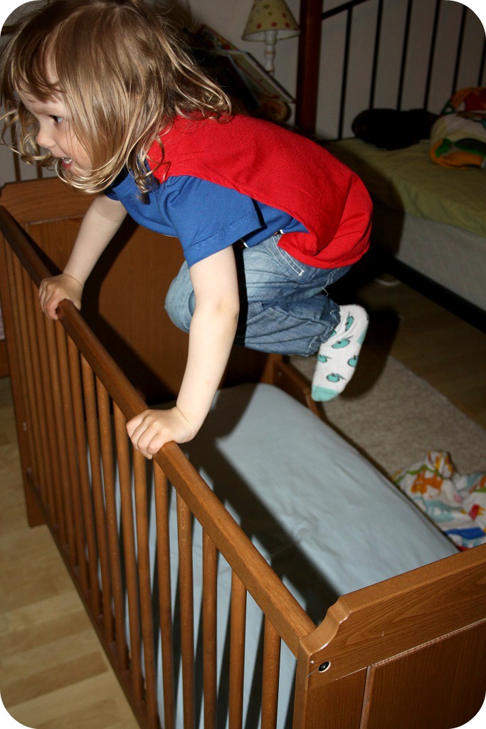 En av reatröjorna bestod av en t-shirt med cape. Milja älskade den. Hon studsade upp och ner i sängen, jag fattar inte ens att man kan komma sådär högt, men hon verkar så lycklig att jag inte vill stoppa henne heller. Och sängen håller.